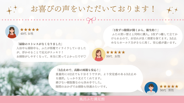 組み合わせ風呂ふたフック 風呂ふた収納のご注意 ●ペースメーカーなどの電子医療機器を装着されている方や、その他の電子医療機器に近づけることは大変危険です。医療機器の正常な動作を損なうおそれがあります。 ●落下した場合は、ケガをするおそれや浴室にキズをつけることがありますので、安全な場所に取り付けてご使用ください。 ●電子機器、磁気カードなど磁気に影響があるものには近づけないでください。 ご使用上の注意 ●本来の用途以外には使用しないでください。 ●記載の耐荷重は目安です。浴室壁面の仕上げの種類、鋼板の厚みによって、マグネットの吸着力が異なりますので、ご使用前に必ず確認してください。 ●ご使用前に、本製品のマグネット吸着面や設置面に汚れや鉄粉などの付着がないかご確認ください。設置面のキズ、サビの原因になります。 ●本製品の吸着面と設置面の水分を拭き取り、乾いた状態で取り付けてください。 吸着力が弱くなります。 ●本製品は壁に取り付けた直後は、強度が弱い可能性があります。3分程度経過してから、ご使用ください。 ●耐荷重以上のものが収納されたり急激な力を加えたりすると、製品が設置面から外れ、落下することがあります。危険ですので十分ご注意ください。 ●収納物を投げ込むような入れ方をしたり、手前に引っ張るような取り扱いをしたりすると、落下するおそれがあります。 ●勢いよくスライドさせると風呂ふたが落下するおそれがあります。 ●地震などの過度な振動により、設置位置のズレが生じ、風呂ふたが落下するおそれがあります。高い位置への設置を避けるなど、設置位置に十分ご注意ください。 ●風呂ふたを収納したまま本製品を移動させないでください。風呂ふたにキズつける原因になります。 ●重心の偏りが出ないように、バランスよくご使用ください。 ●上ホルダー、下ホルダーにものを引っかけたりしないでください。ズレたり外れたりするおそれがあります。 ●期間同じ場所に設置し続けると、設置面の変色やマグネットの色が移る場合があります。定期的に取り外し、設置面や本製品を洗浄してください。 ●直射日光のあたる場所、火のそばや高温になる場所では使用しないでください。