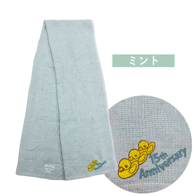 お風呂といえば、あひるちゃん!ということで3羽のアヒル。そして、15周年記念ロゴの刺繍をあしらいました