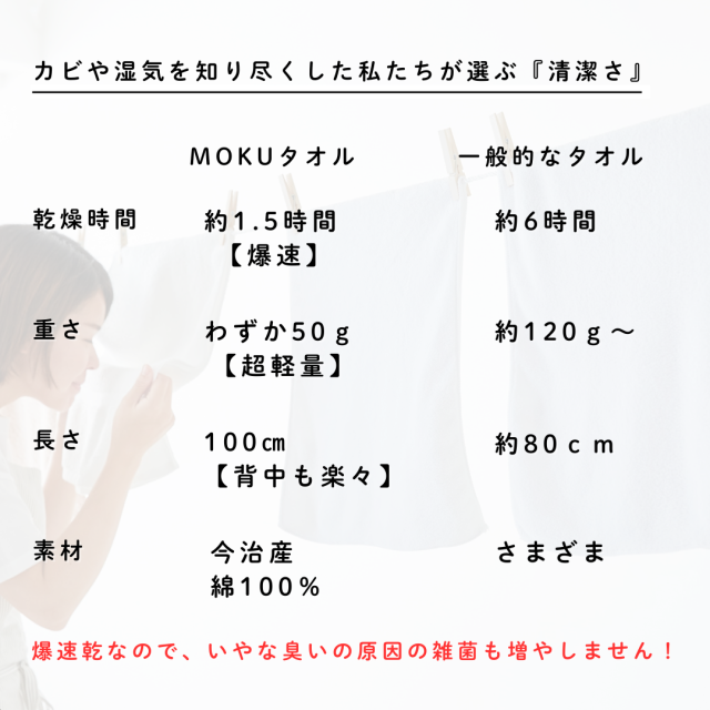 このMOKUタオルは、部屋干しわずか1.5時間で乾ききります。